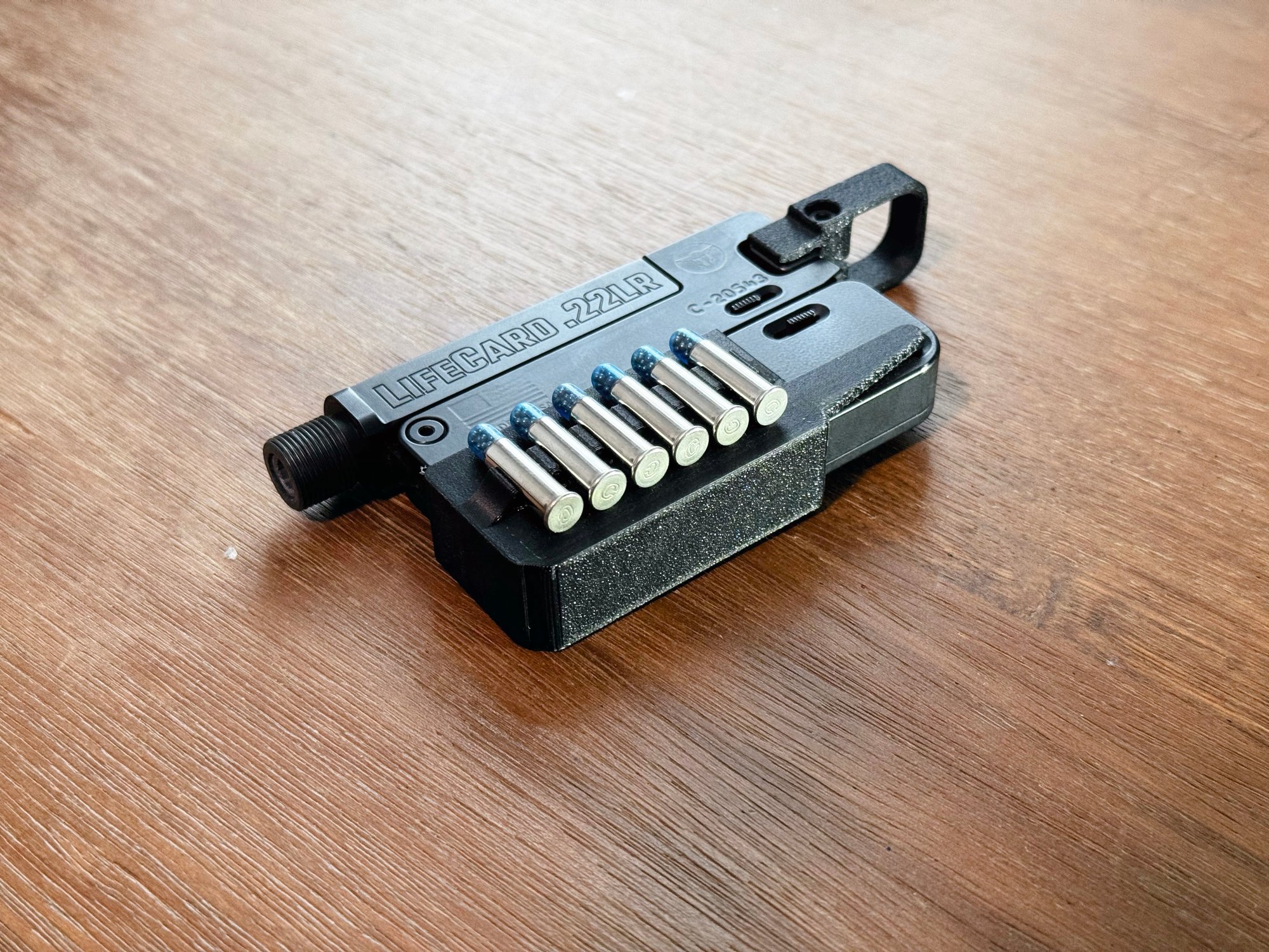 This part goes onto your LifeCard and allows you to carry 6 extra rounds while still having access to the built in compartment. The piece slides into the hole on the grip and can swing in and out easily as needed. If you want to make it more permanent then a small dot of glue can be used to keep in place more permanently.
